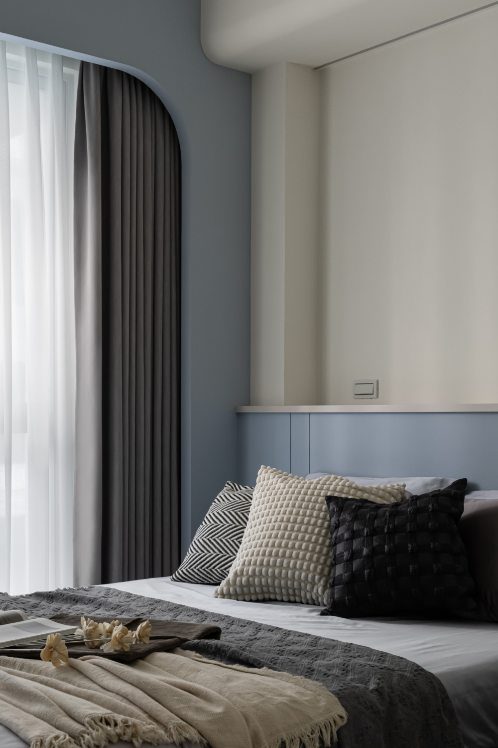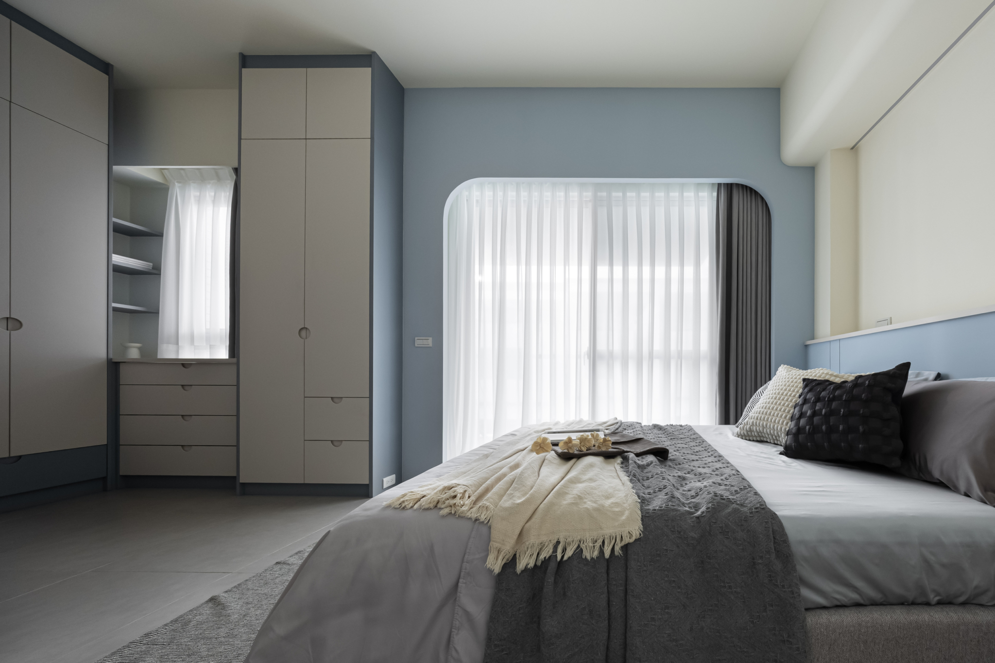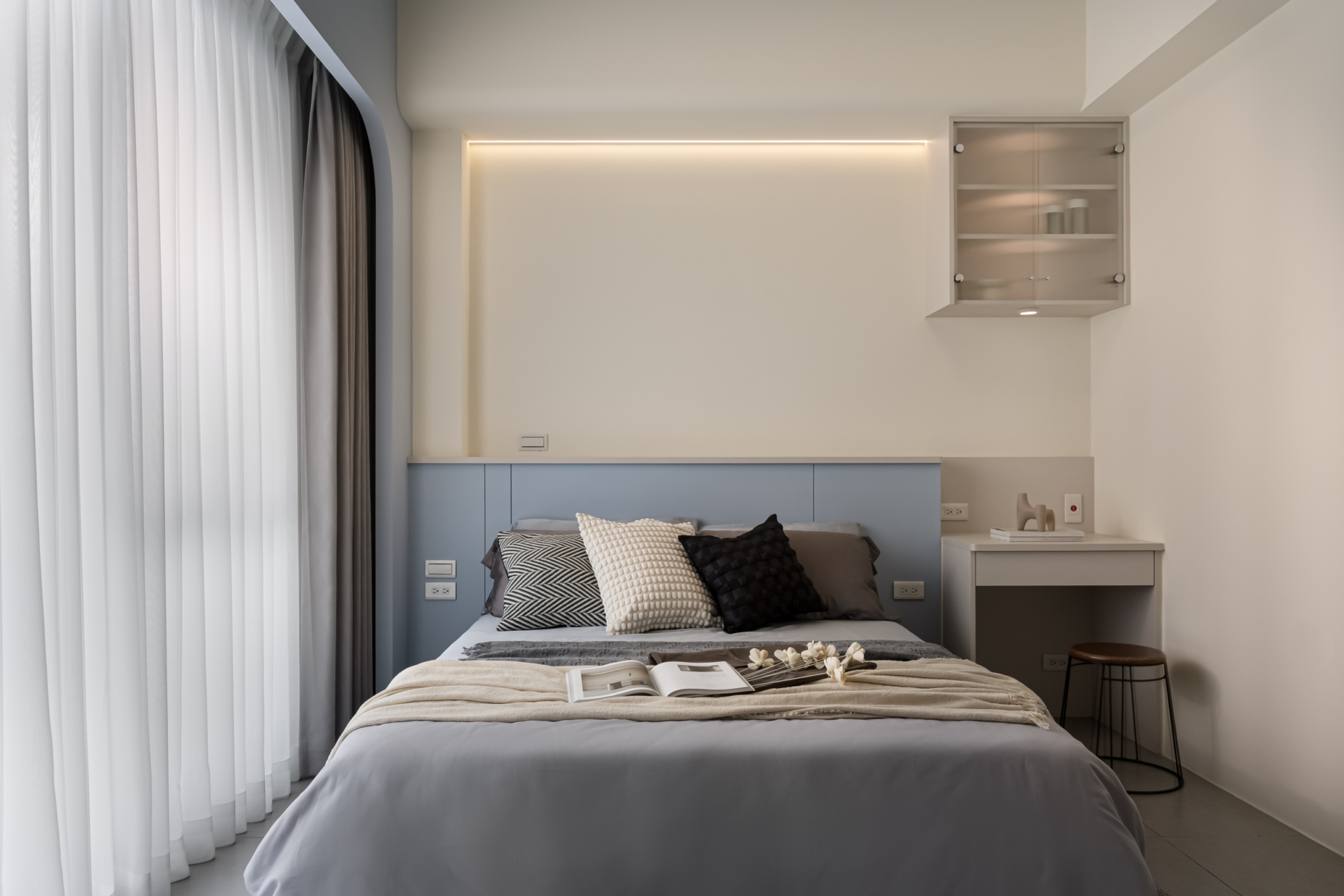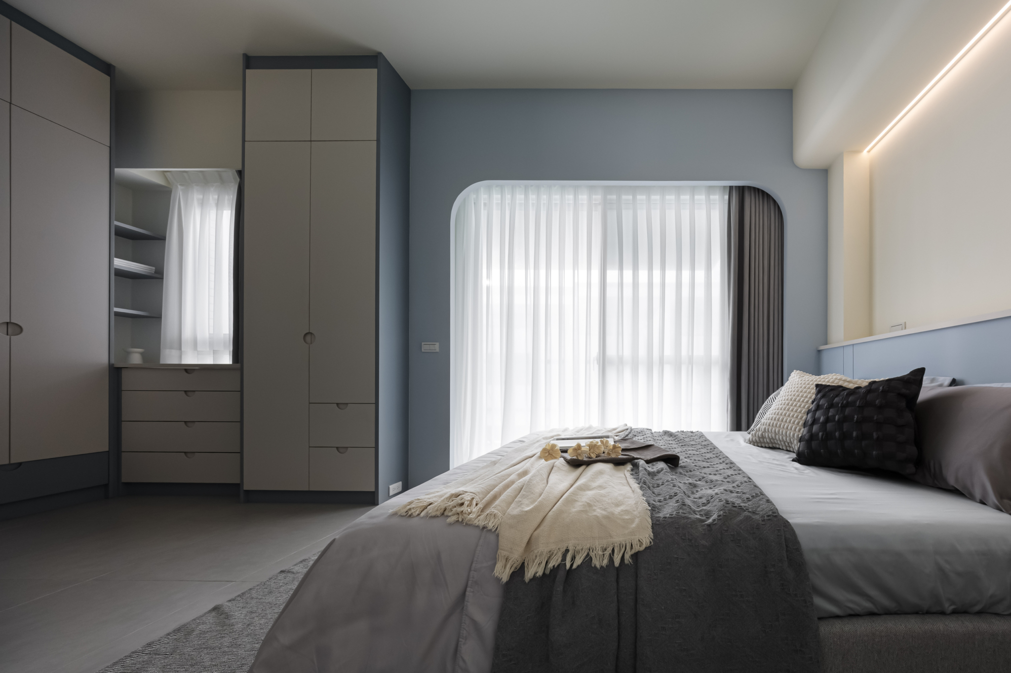 溫柔的色彩緩緩入夢,光線透過白色窗紗柔化,將臥室化為純淨而自在的棲所。