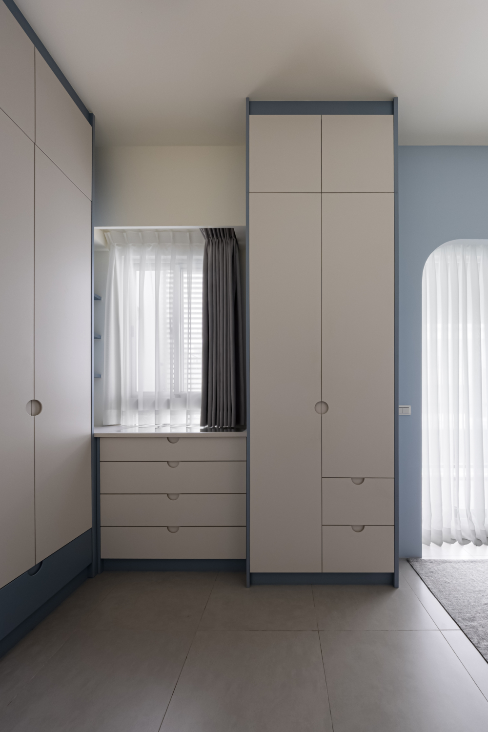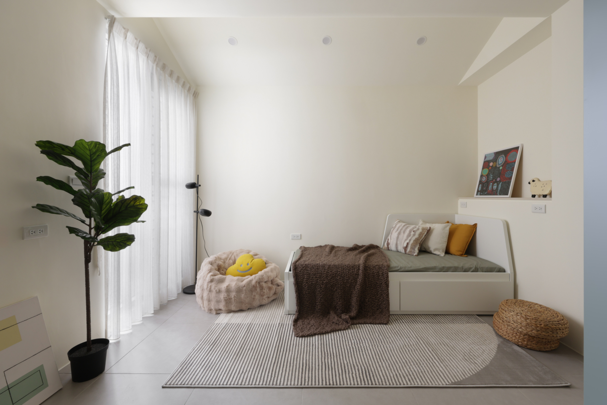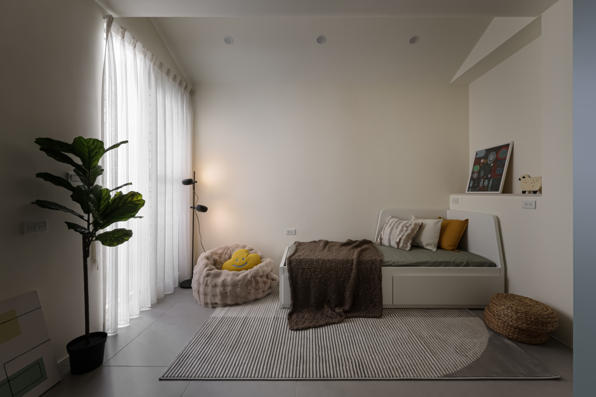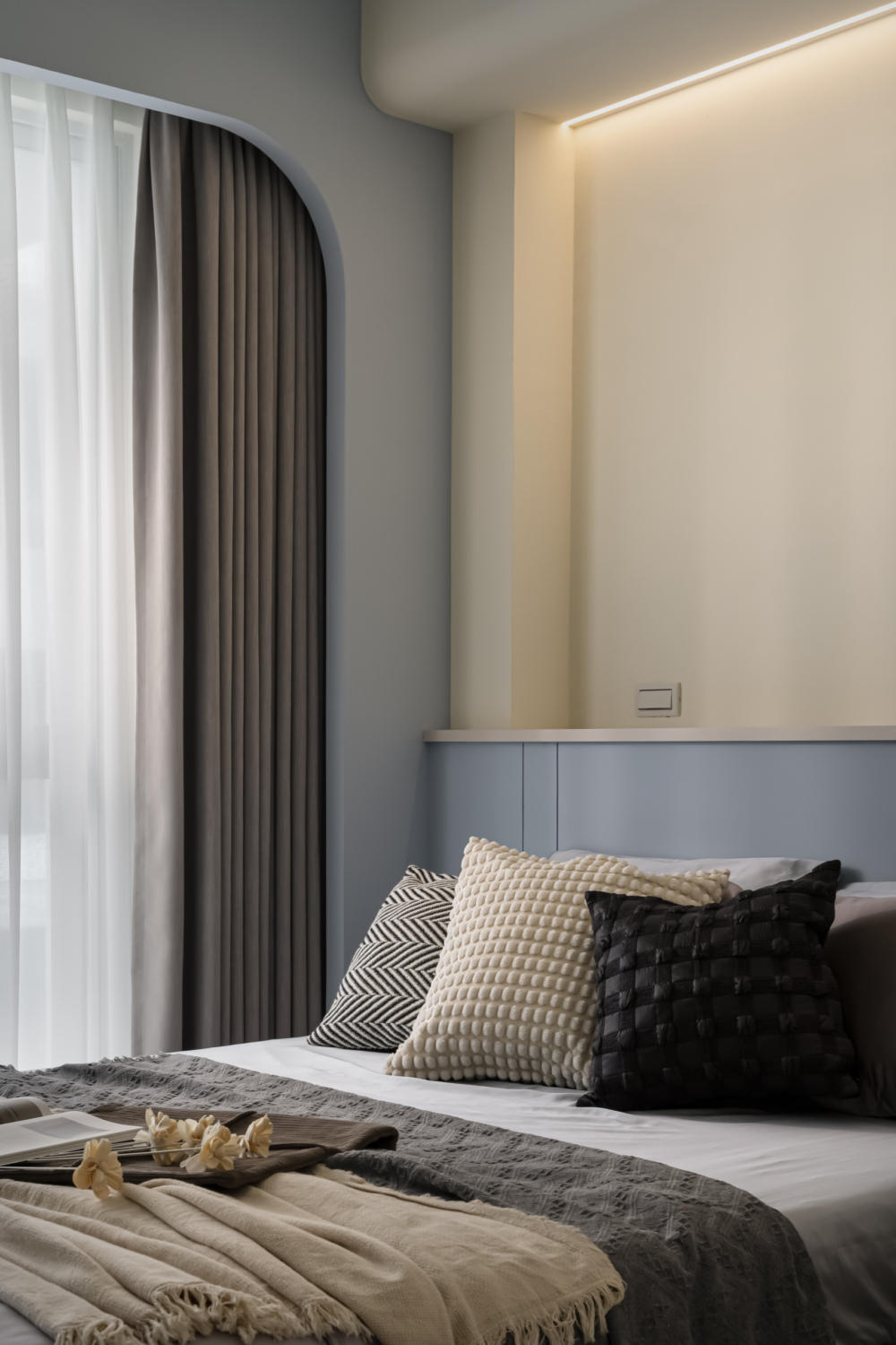 溫柔的色彩緩緩入夢,光線透過白色窗紗柔化,將臥室化為純淨而自在的棲所。