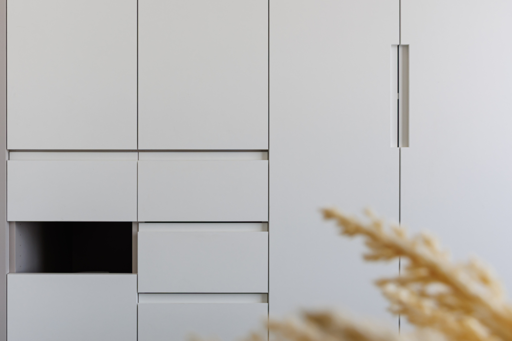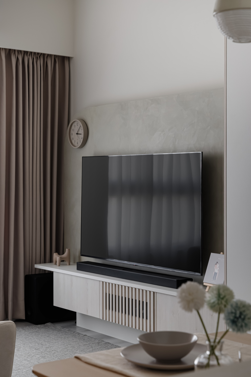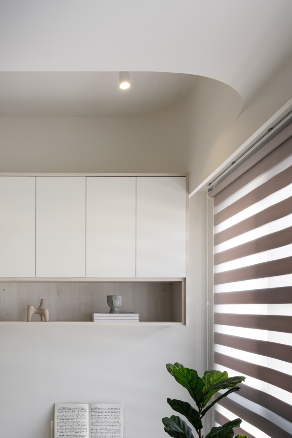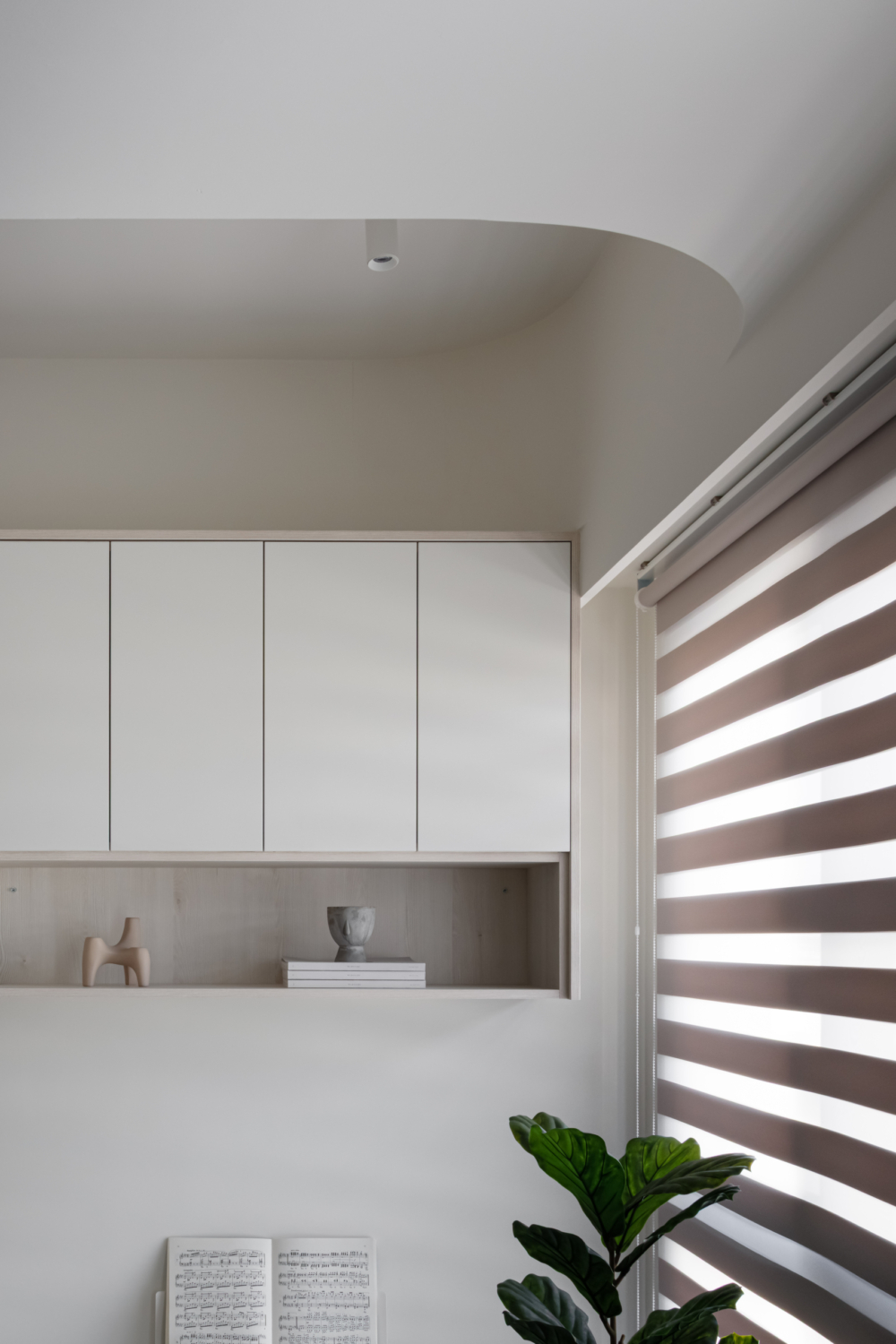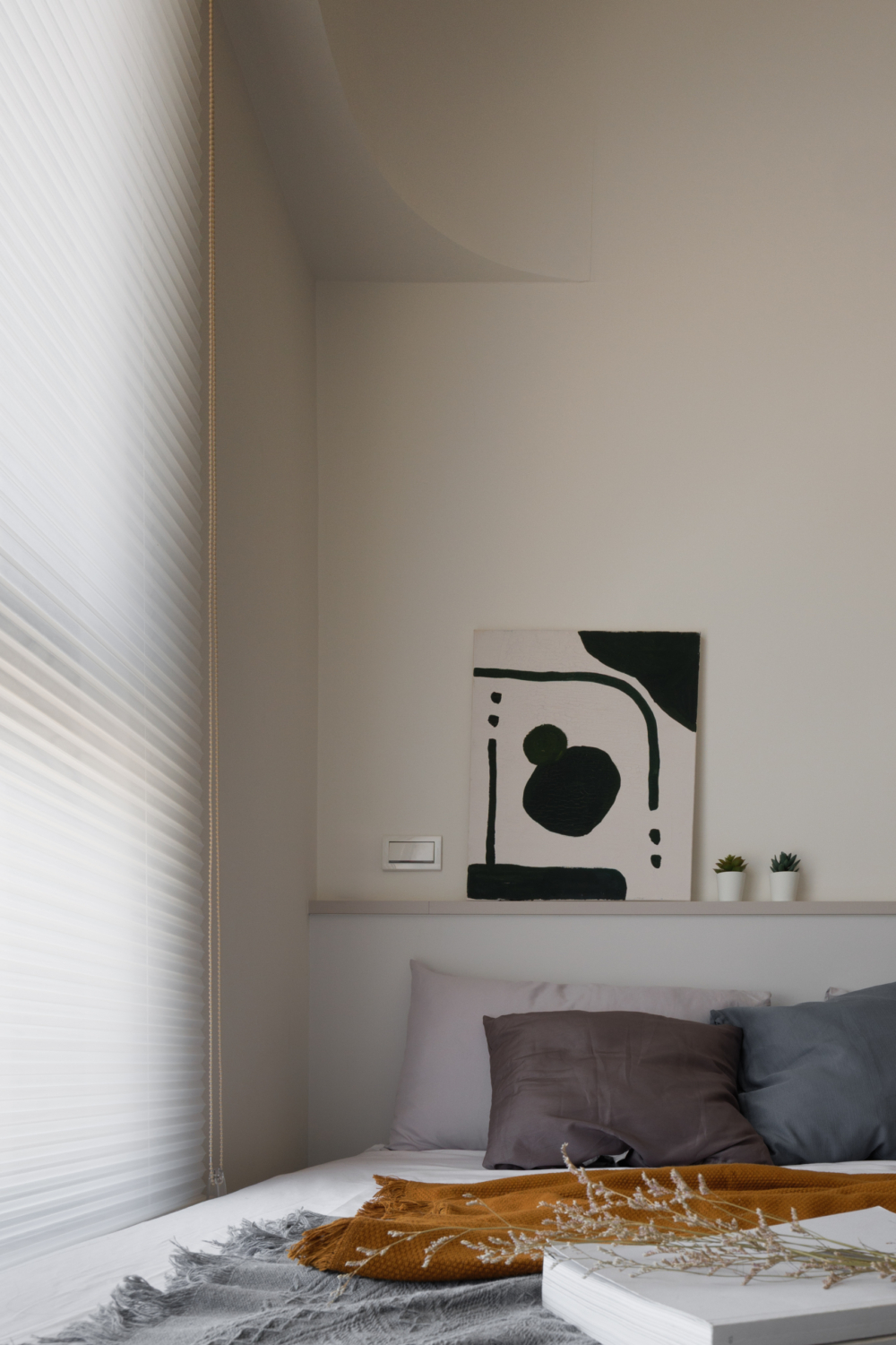溫潤白與霧灰構築寧靜的日常基調,柔和圓角揉進空間細節, 輕描慢寫地編織出一室靜謐。