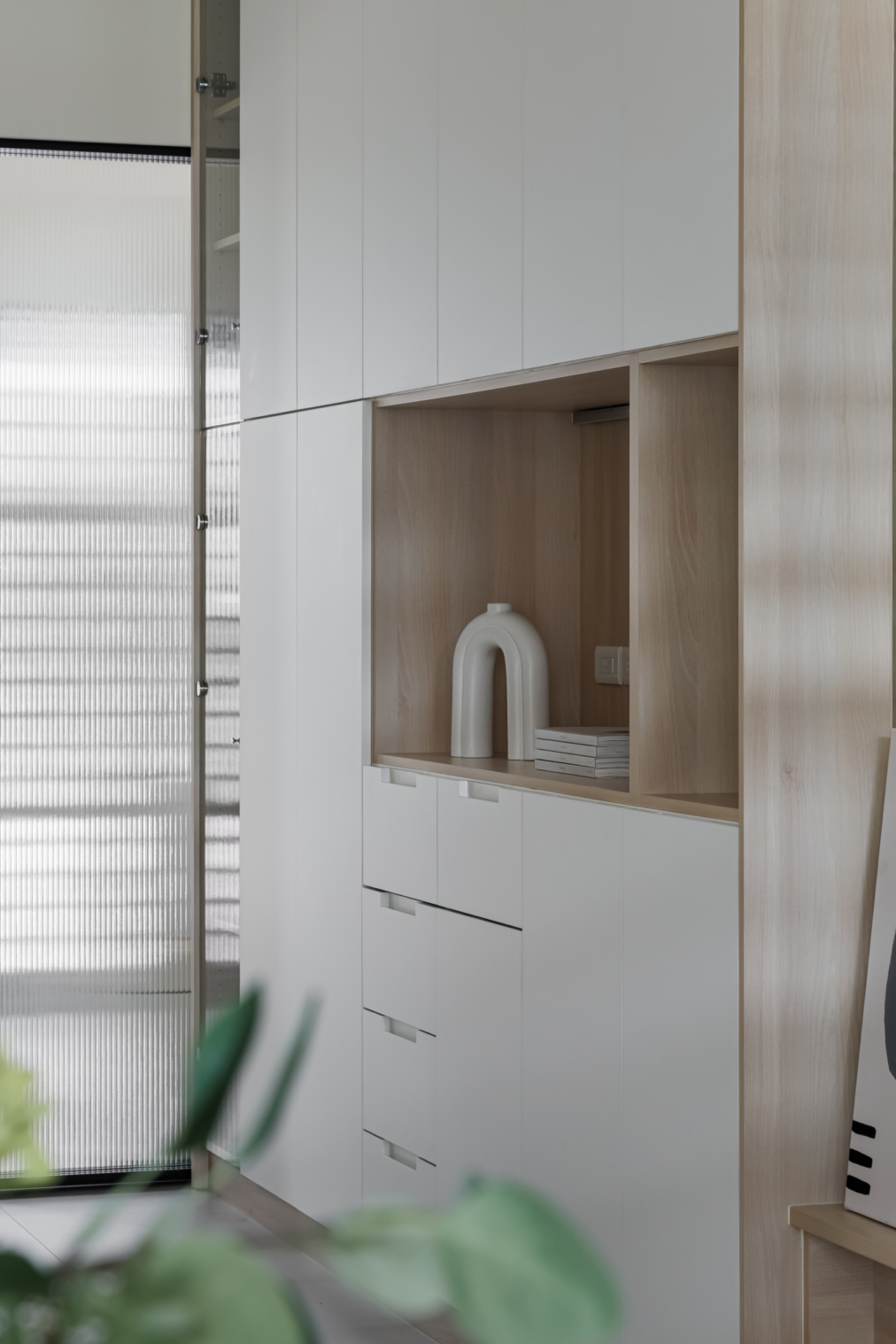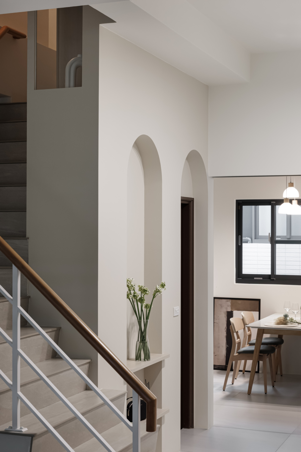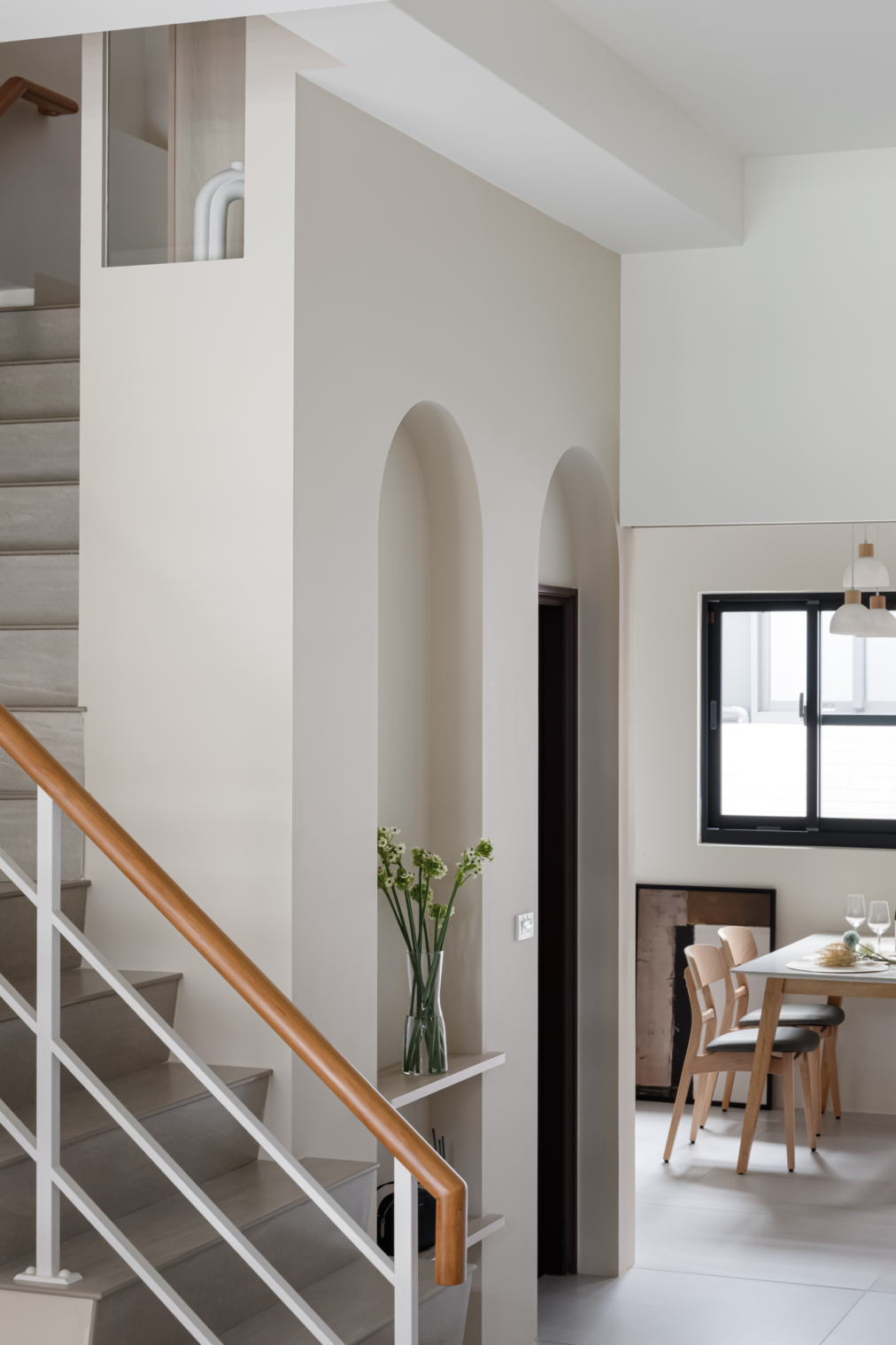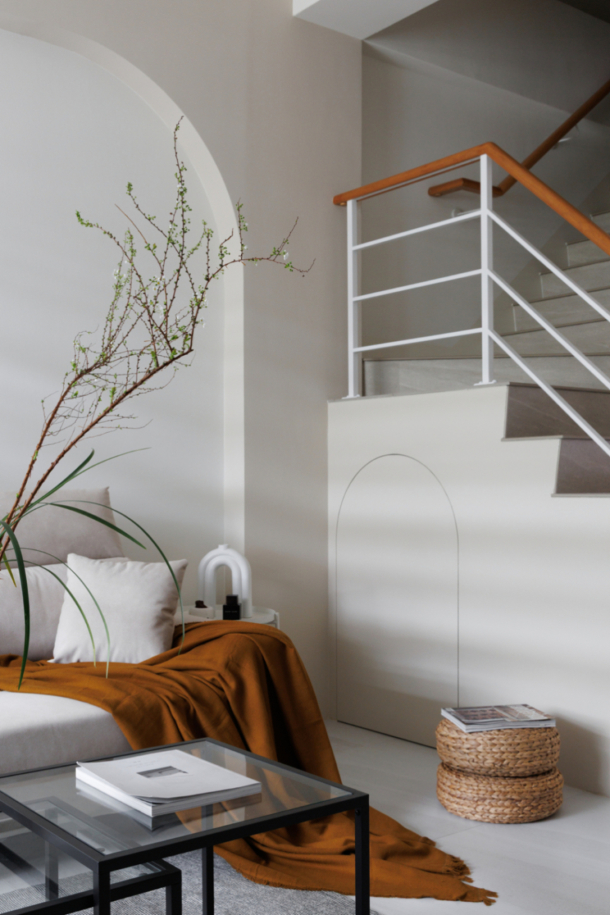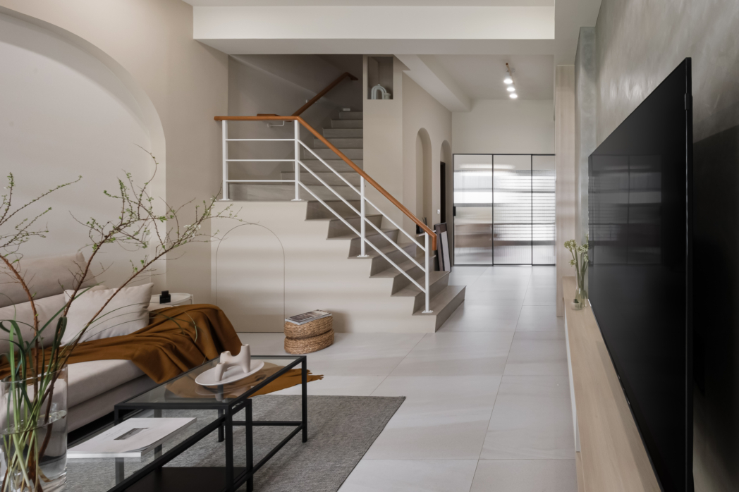 弧形牆面柔化了空間的線條,像是一種擁抱,溫柔地迎接每一個歸來的瞬間;木質地板傳遞著自然的溫度,隨著每一步行走,彷彿聽見生活的呢喃。