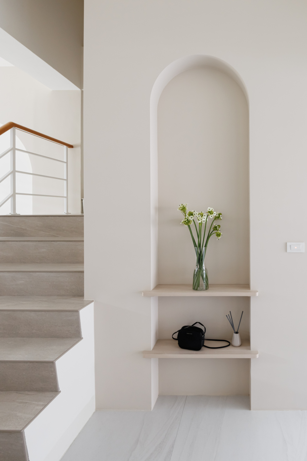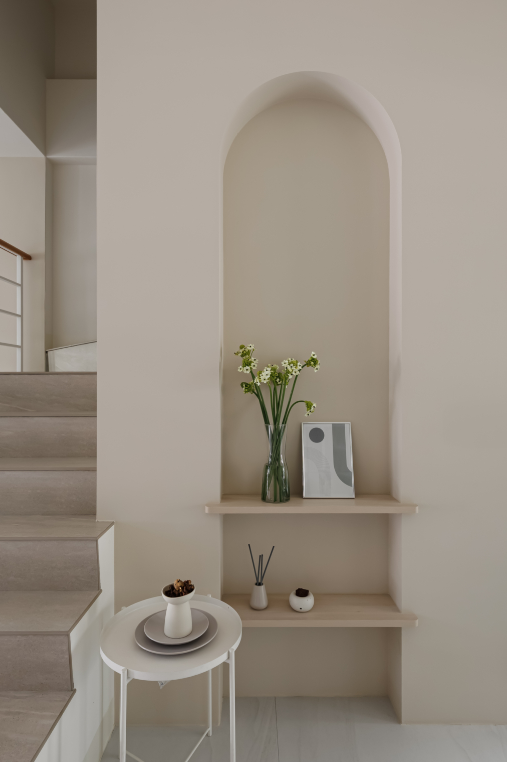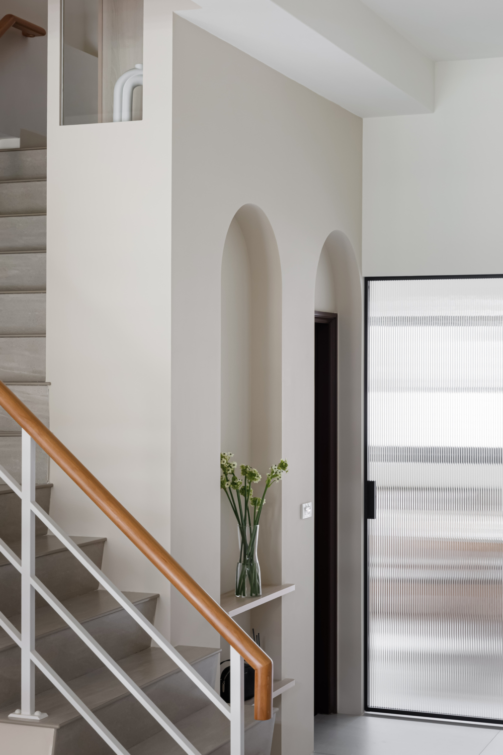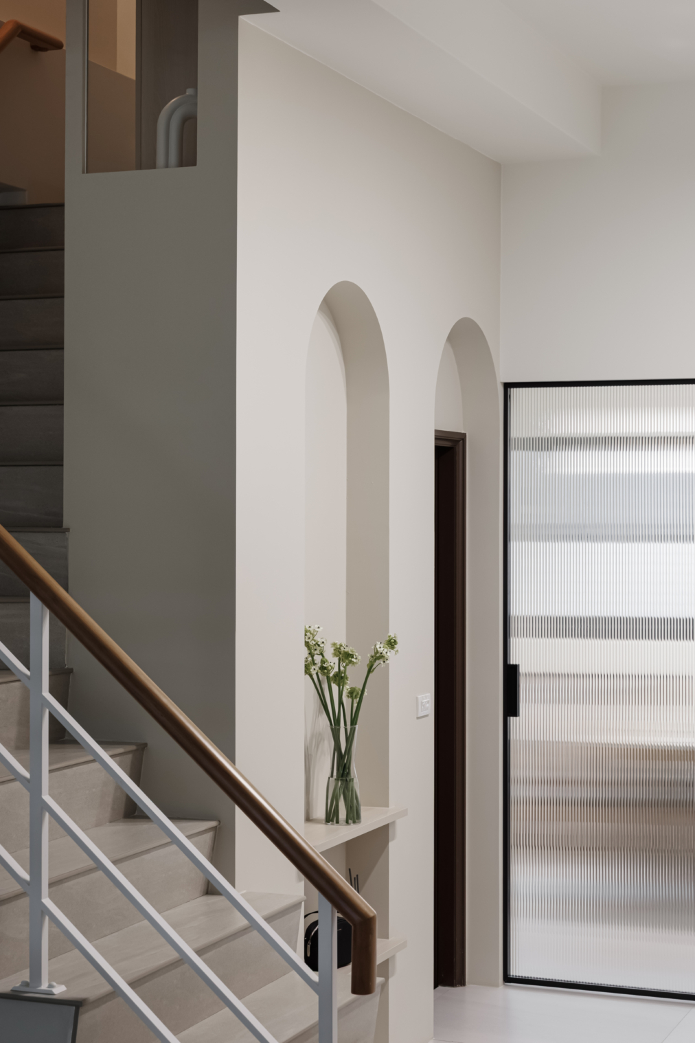 弧形牆面柔化了空間的線條,像是一種擁抱,溫柔地迎接每一個歸來的瞬間;木質地板傳遞著自然的溫度,隨著每一步行走,彷彿聽見生活的呢喃。