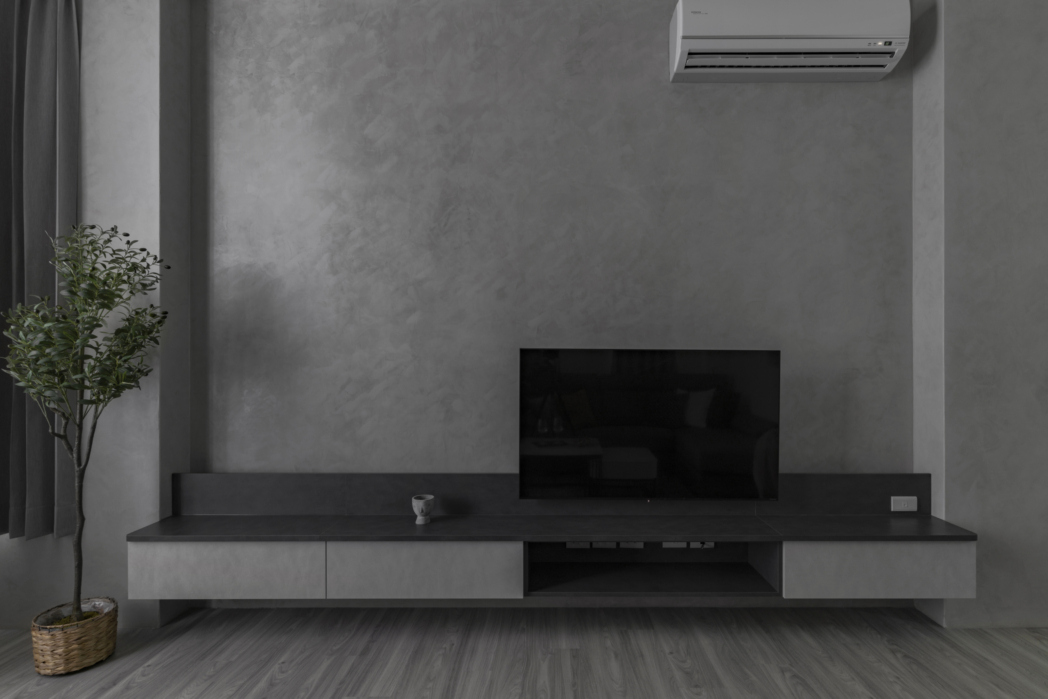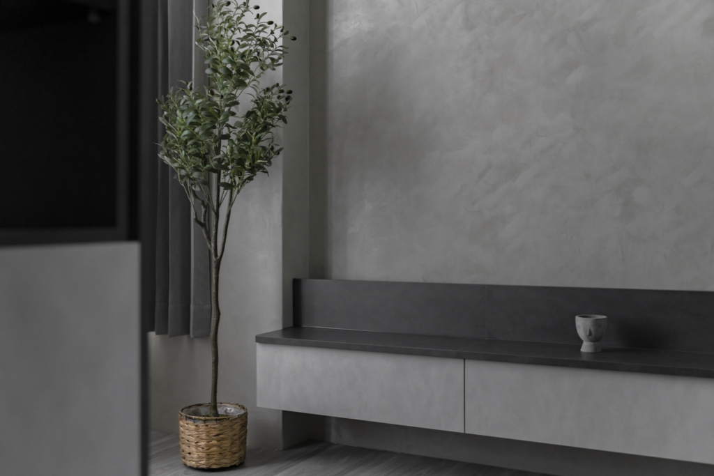 灰色系的手感紋路藝術塗料藉由光影映照出獨特的紋理脈絡。 一個低彩度的空間,讓每個物件都充滿張力。
