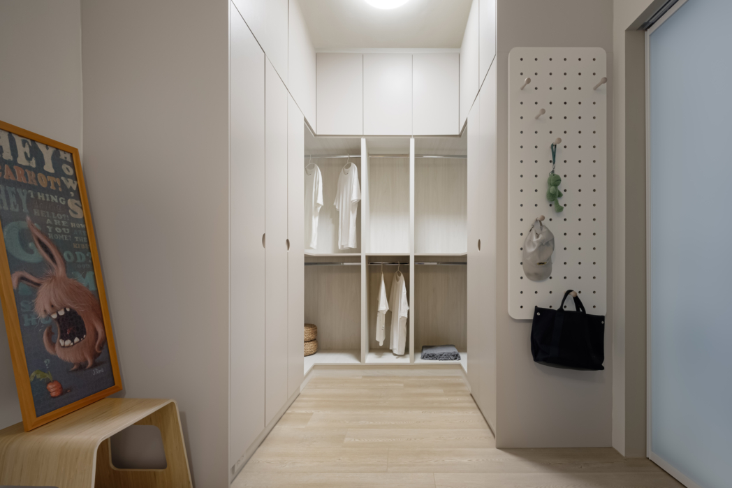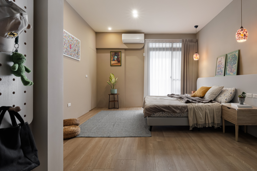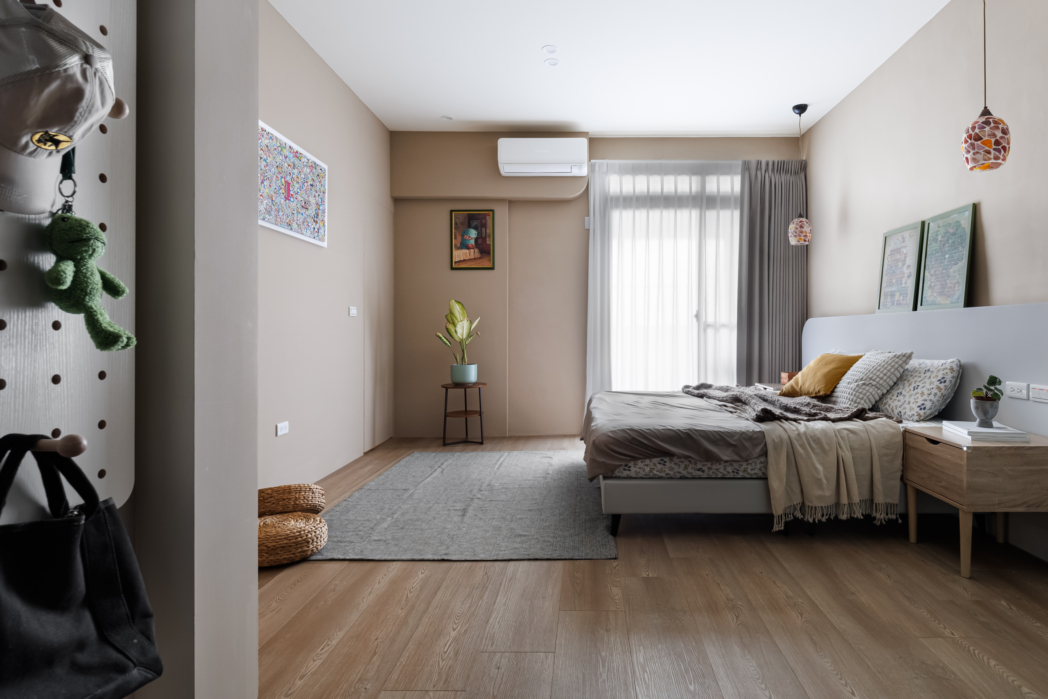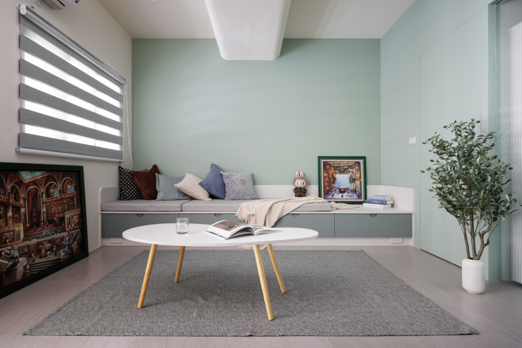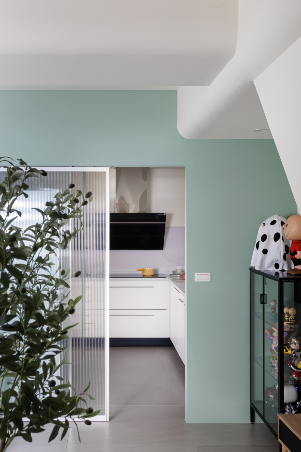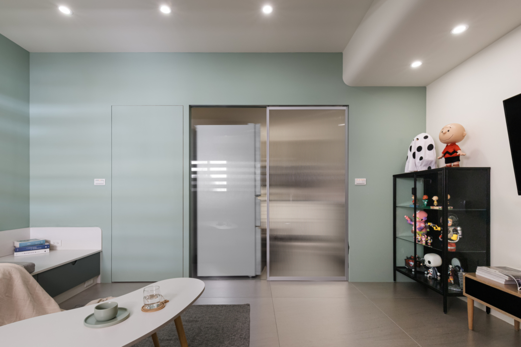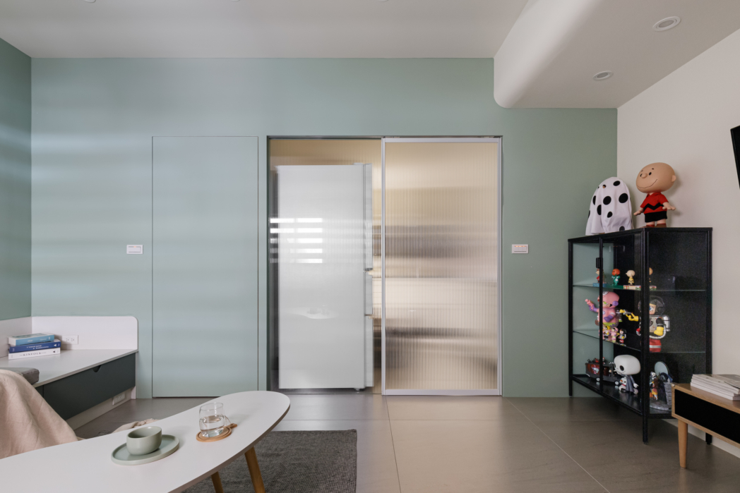 透過低飽和度的綠色與淺木色元素,為空間注入柔和且富有層次的視覺體驗。溫潤的莫蘭迪綠調,宛如記憶中老屋窗前的植物綠意,使人感受到寧靜與療癒。