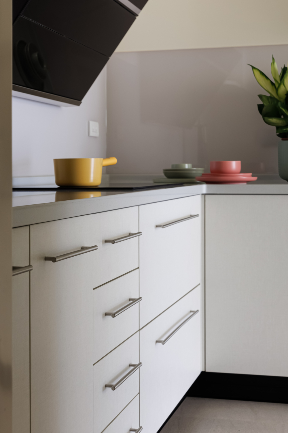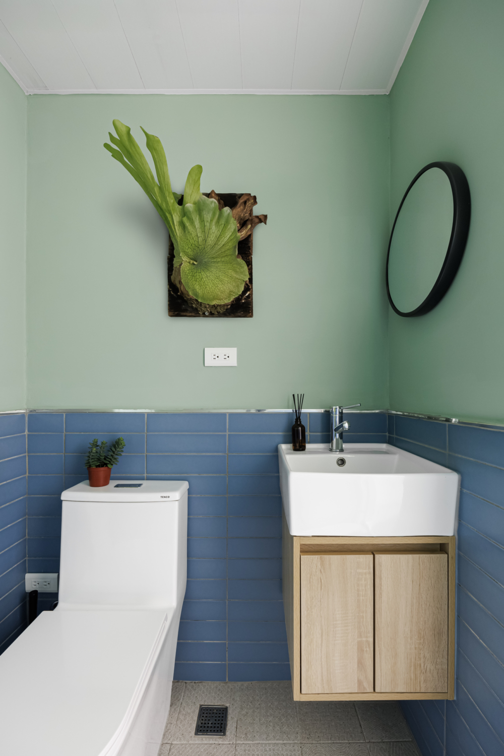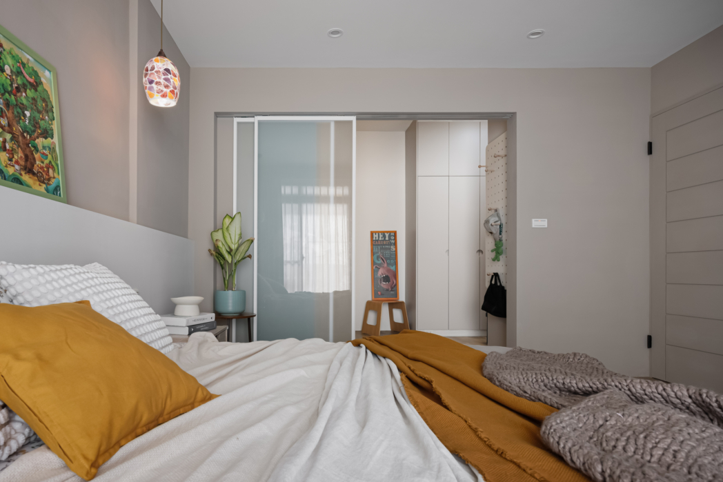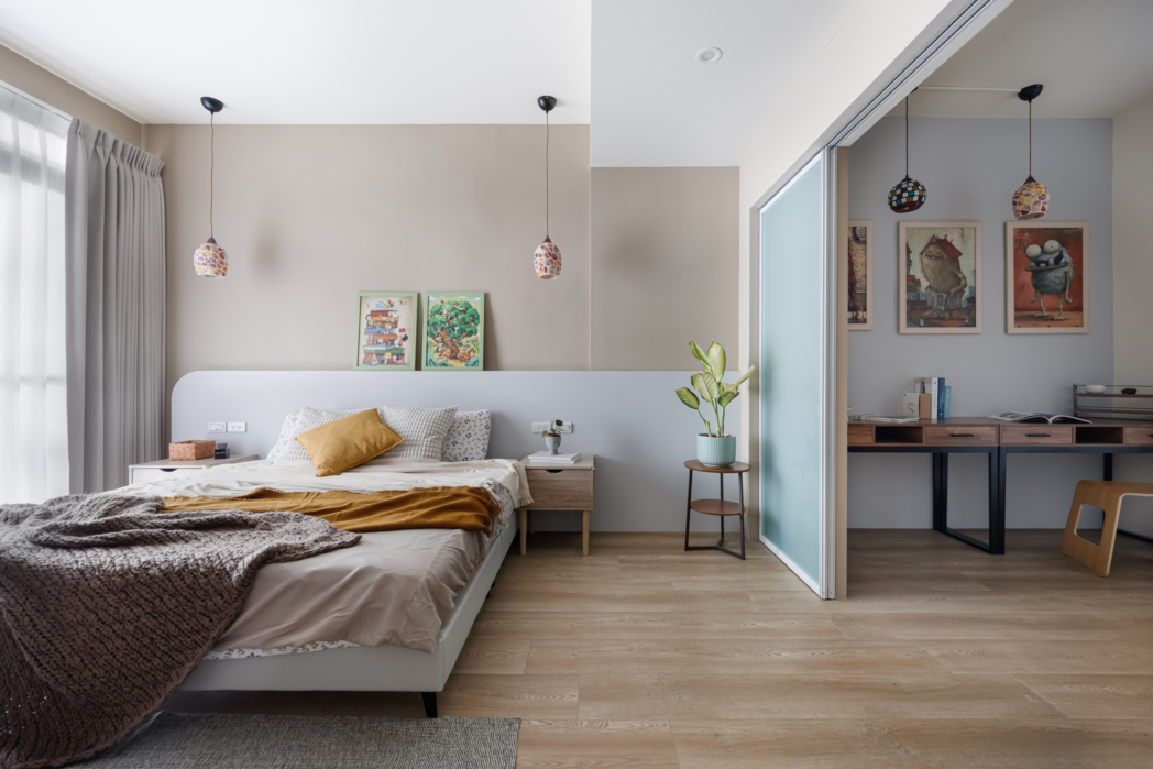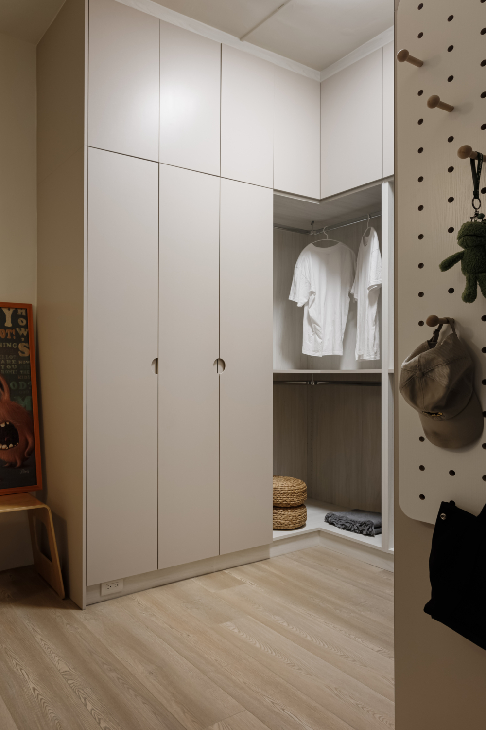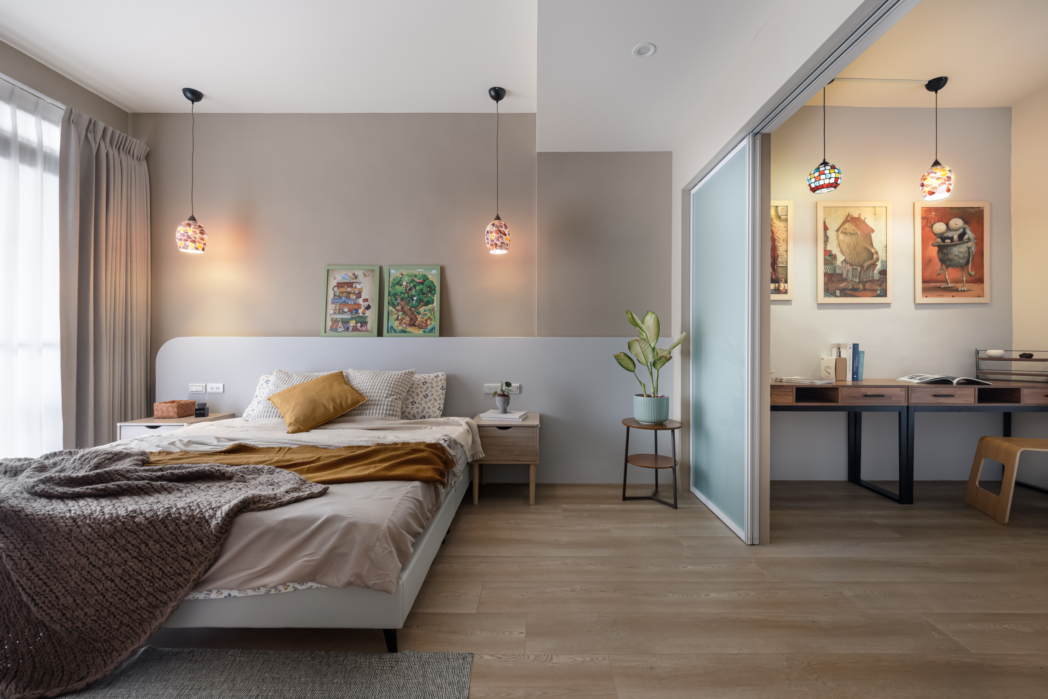 透過低飽和度的綠色與淺木色元素,為空間注入柔和且富有層次的視覺體驗。溫潤的莫蘭迪綠調,宛如記憶中老屋窗前的植物綠意,使人感受到寧靜與療癒。