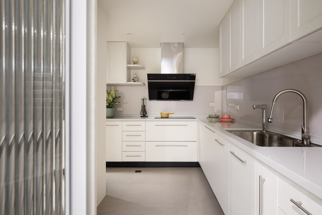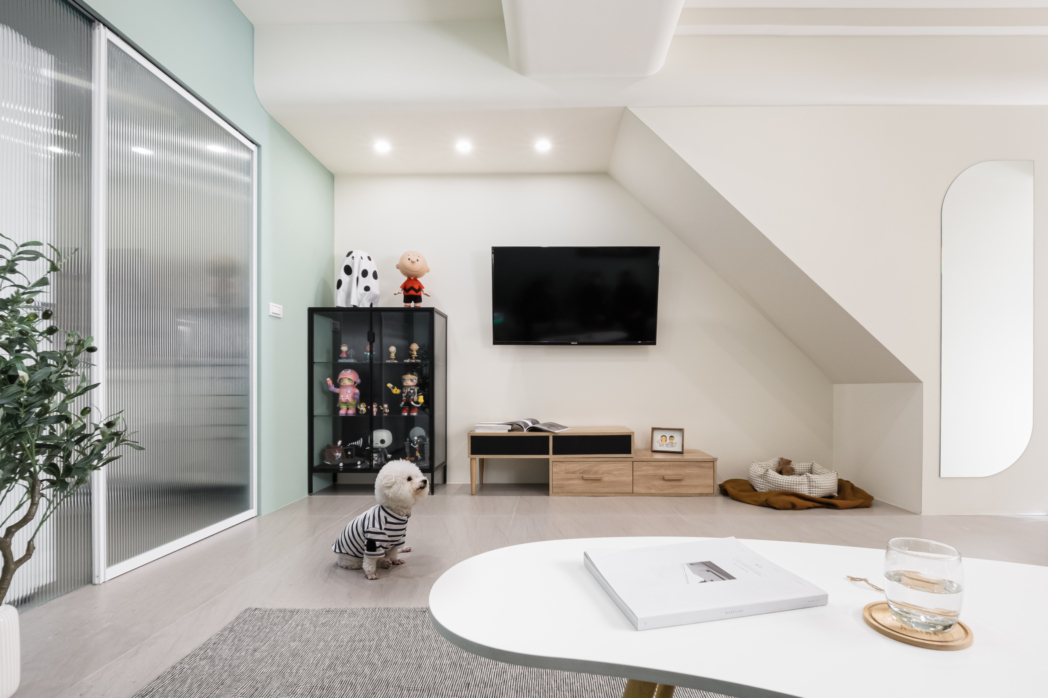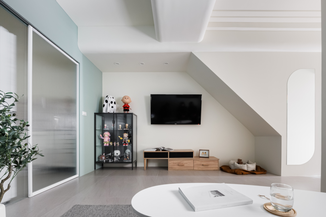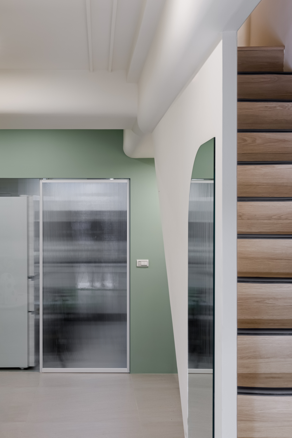 搭配霧面玻璃與溫潤木質樓梯,讓光影在空間內流轉,營造通透且輕盈的氛圍。
