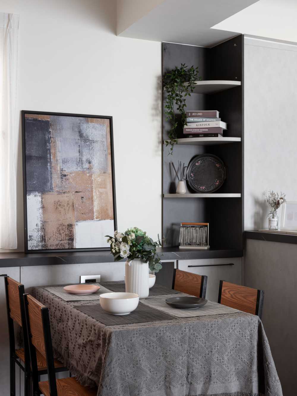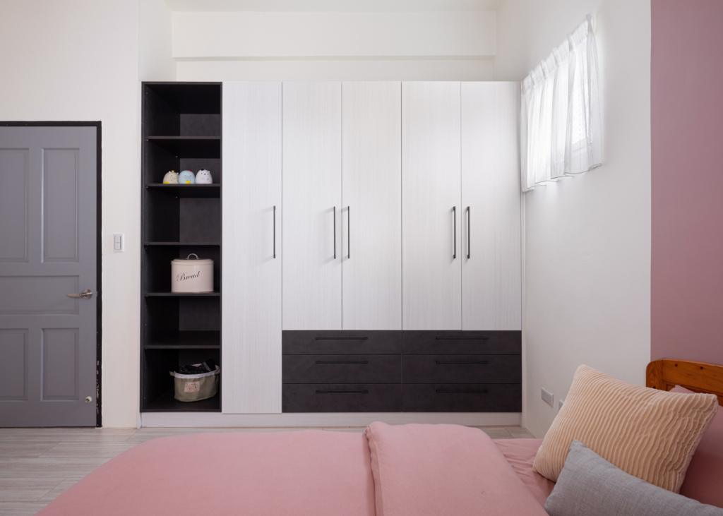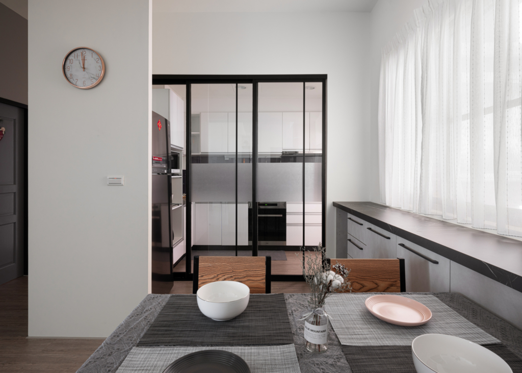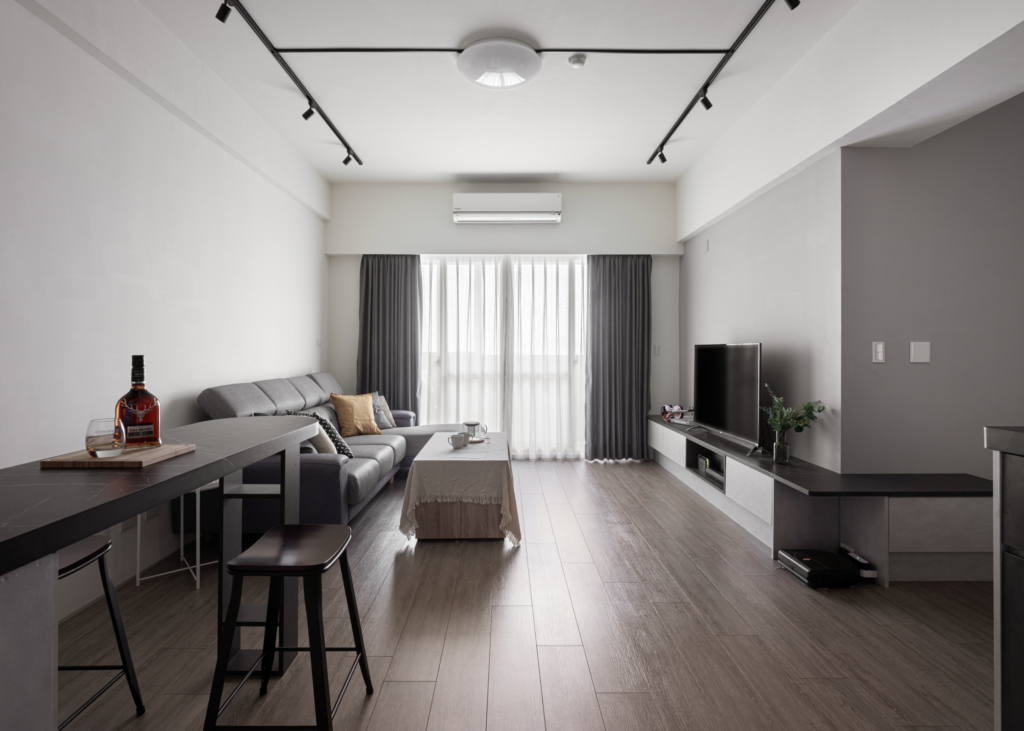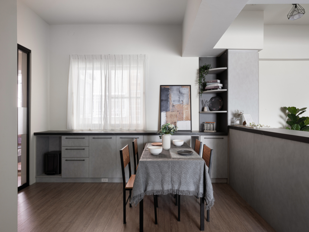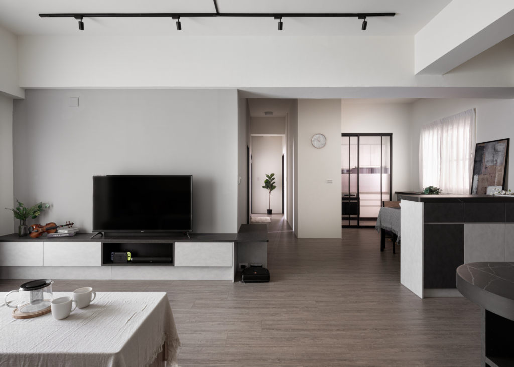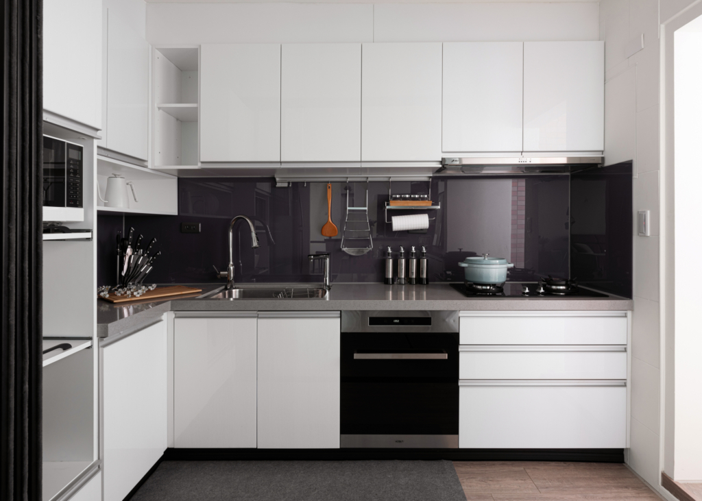 Egger系統板、不銹鋼廚具設計、HOSUN廚具設備、鋁框烤漆推拉門、富美家超耐磨地板、虹牌調色漆、Blum五金、川湖滑軌。